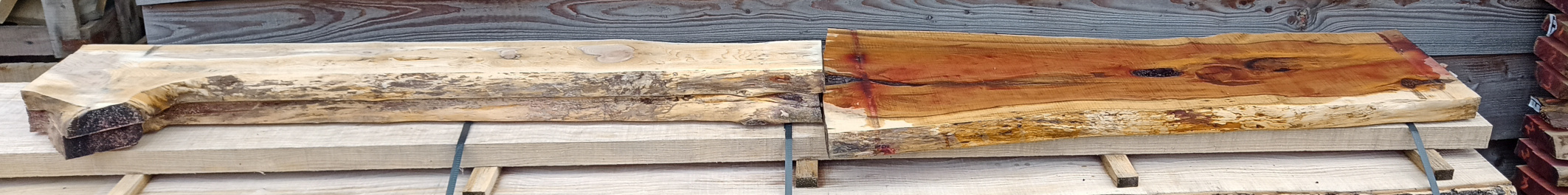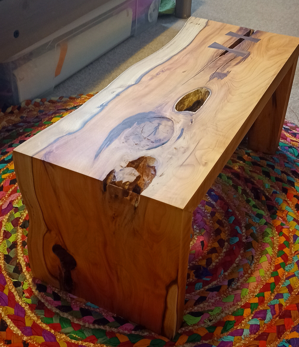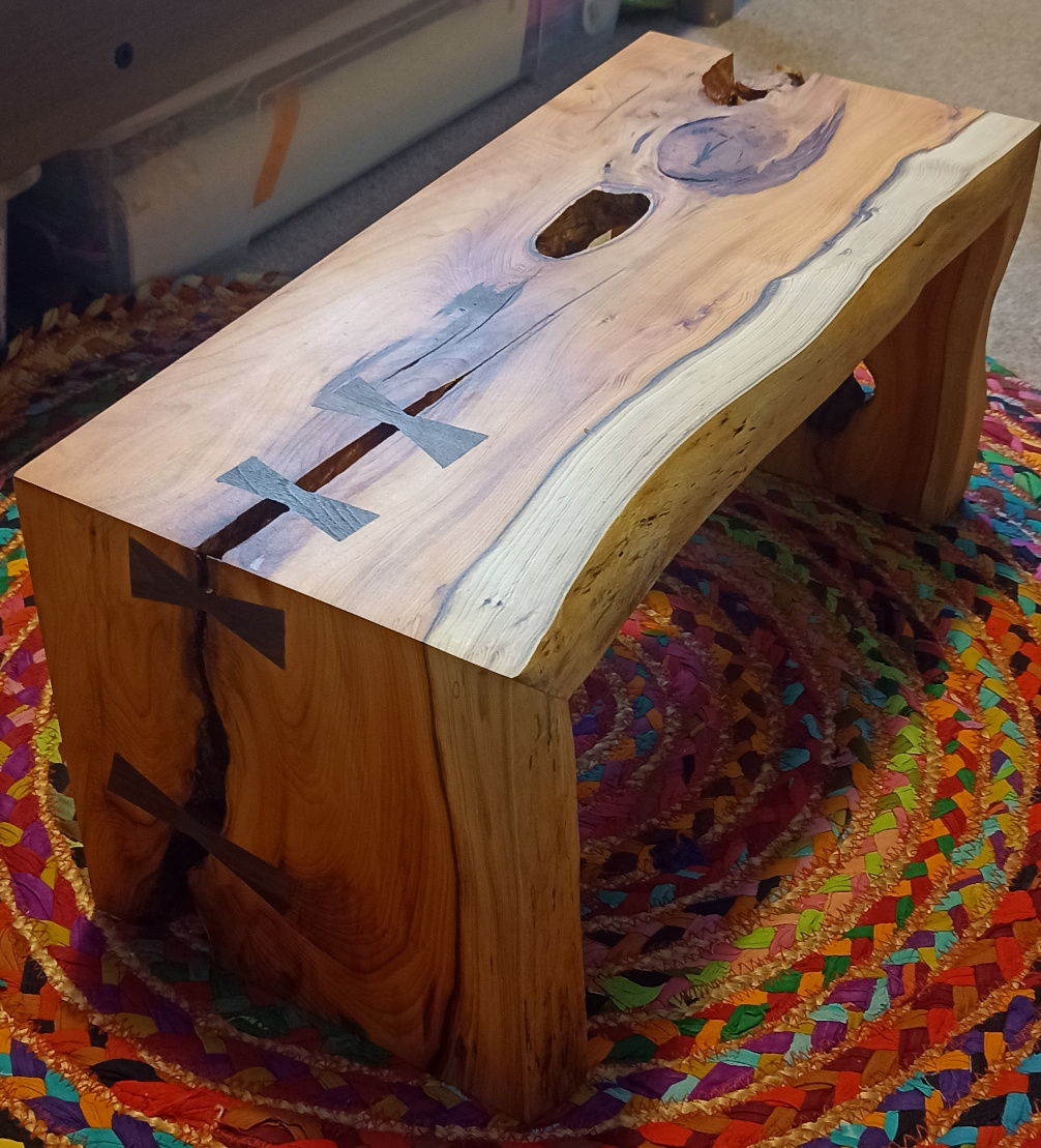 I picked up some nice pieces of Yew which I'd never really seen before and was amazed by the colour. The deep red heartwood and the lighter sapwood is a nice contrast. The right hand piece was good in that it was a single board which had some holes and splits to work with. I'd considered doing an epoxy pour but settled on some deep bowties which I though were a bit more natural.
